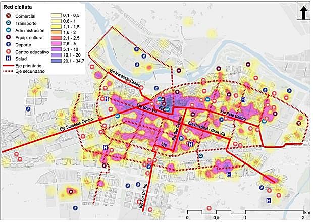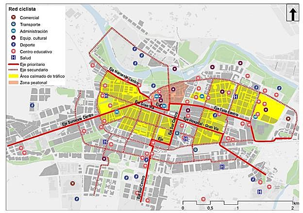 Para la movilidad ciclista, los recorridos de mayor importancia los conforman los ejes suroeste-centro; noroeste-centro, sur-centro, Gran Vía y Hospital-Gran Vía. Pero el sistema establece dos modelos, uno con infraestructuras no necesariamente segregadas del de los demás vehículos para los más avezados y otro para usuarios con vías segregadas.