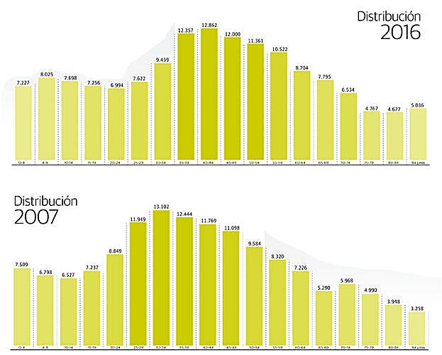 El padrón continuo del INE permite hacer la radiografía de cómo era la población de la capital en el 2007 y cómo es al cierre de una década de crisis, en el 2016. Durante ese periodo la ciudad ha crecido en cifras absolutas de población. Los 145.866 logroñeses de entonces son ahora 150.876, es decir, hay 5.010 vecinos más... Pero esa población es, por un lado, más mayor, y, por otro, ha perdido buena parte de su, digamos, fuerza productiva (y reproductiva).