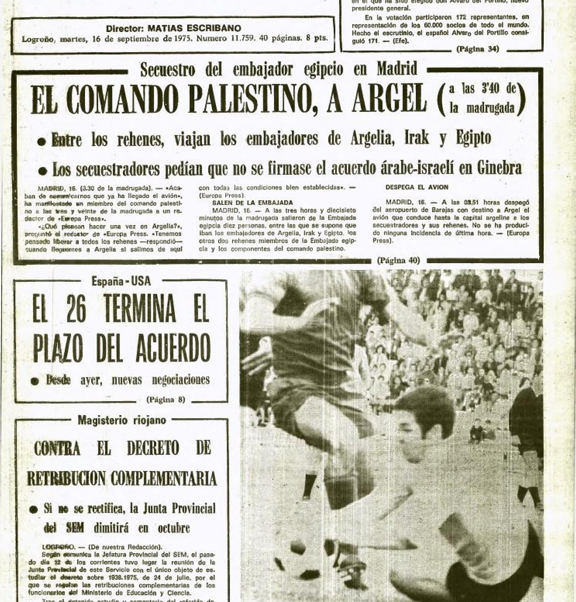 El 16 de septiembre de 1975 el periódico agrupaba bajo la sección Sucesos varios hechos dramáticos ocurridos en España. El editor quiso destacar el trágico final de dos pilotos de automóvil, uno español, otro alemán, que perdieron la vida al intentar batir el récord mundial de salto de coche.