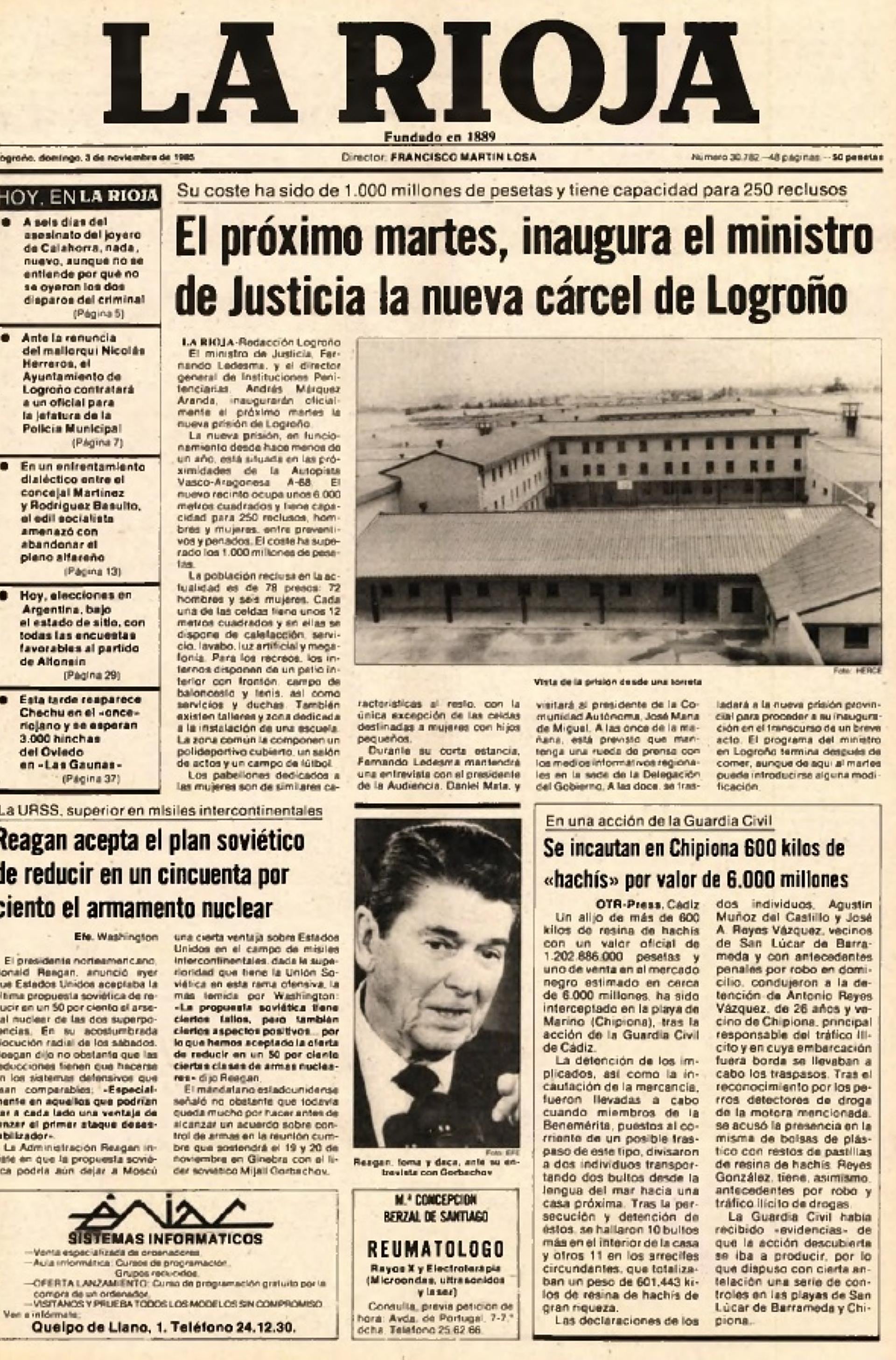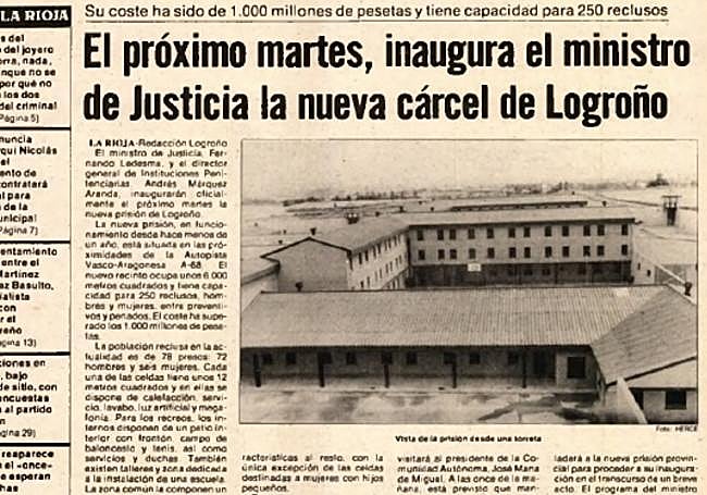 El periódico LA RIOJA del 3 de noviembre de 1985 anunciaba en portada la que inminente inauguración de la nueva cárcel de Logroño. Lo curioso es que la prisión llevaba en funcionamiento ya cerca de un año. Con capacidad para 250 reclusos, el edificio, de 6.000 metros cuadrados, costó más de mil millones de pesetas. Entonces se dio cuenta de un total de 78 presos, la mayoría de ellos (72), hombres, ubicados en celdas de 12 metros cuadrados. El ministro de Justicia, Fernando Ledesma, y el director general de Instituciones Penitenciarias, Andrés Márquez, visitarían Logroño para inaugurar oficialmente las nuevas instalaciones, construidas en el límite con Lardero, en las inmediaciones de la AP-68.