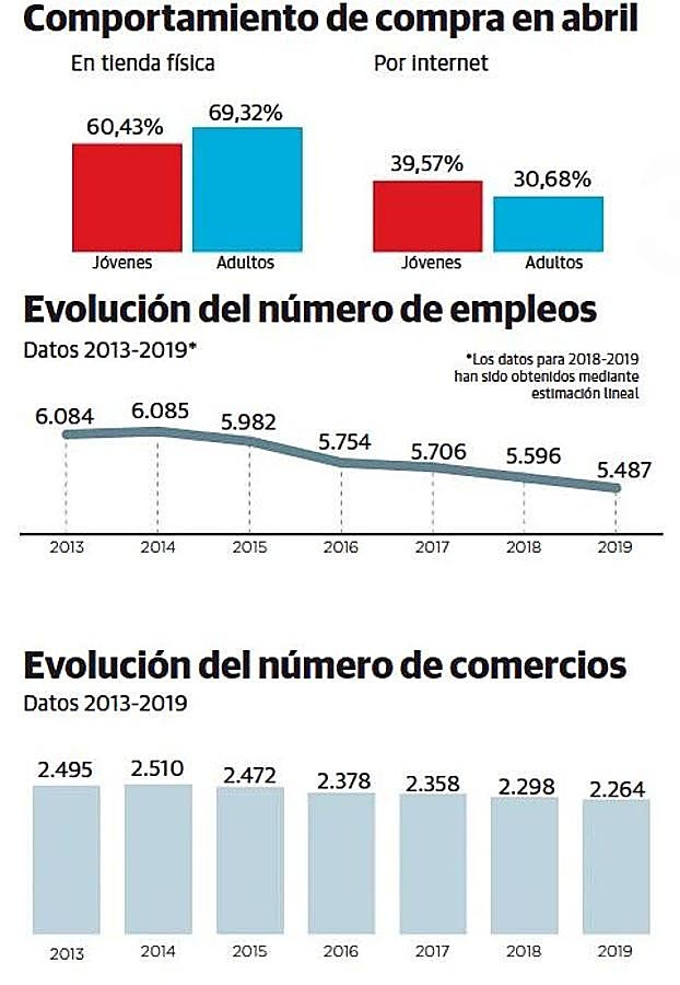 En lo que a empleo se refiere, desde 2013 a 2019 se pasó de 6.084 empleos a 5.487, con una caída del 10,87%. Lo mismo sucedió con los establecimientos físicos, cuyo número también bajó el 10,2% en este periodo, para ir de 2.495 a 2.264. Estos comercios se encontraban, sin embargo, en una ciudad cuya población fue subiendo desde el año 2000 el 14,6% hasta llegar a los 152.727 habitantes de 2019, si bien con un progresivo envejecimiento.
