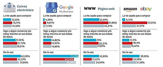 Sobre el consumidor y sus hábitos, de las encuestas se extrae que el comercio tradicional tiene más dificultad para retener a los jóvenes, que si bien se valora la comodidad para ir andando a la tienda, también se observa dificultad para aparcar y participar en las actividades que se proponen y que, si los jóvenes estiman el horario de las tiendas y la facilidad para realizar devoluciones, los adultos aprecian la diversidad comercial. Entre los puntos flacos, la falta de adaptación a las nuevas tecnologías. Así, la tienda física importa. Los jóvenes son los que más usan las redes para comprar. Los adultos usan primero la web y, luego, WhatsApp.