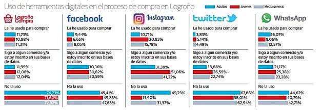 Además, se constata que las redes sociales «son una herramienta fundamental para generar marca, abrir nuevos canales de comunicación y ventas, y para nuevas formas de segmentación. Esta incursión en las redes sociales es un punto débil en el comercio minorista de Logroño». Uno de los cuadros del Plan Estratégico que recoge esta página muestra la disponibilidad de los comercios minoristas de Logroño en las principales redes sociales y otras herramientas 'on line' en 2020.