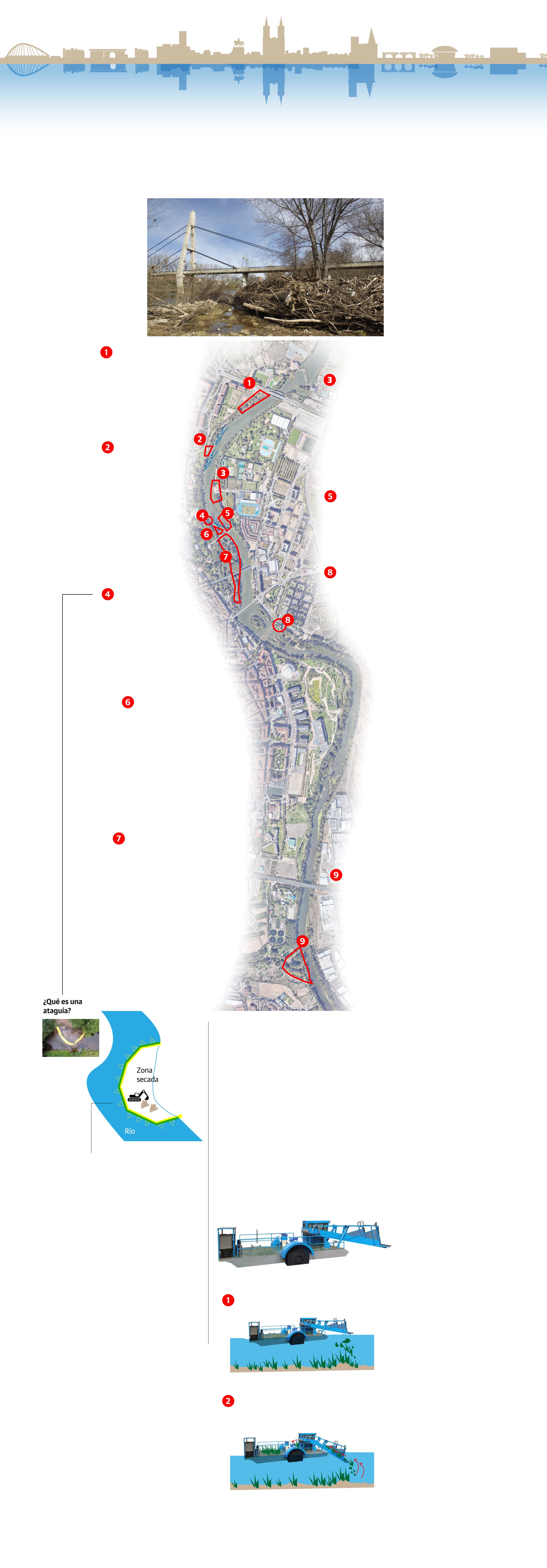 Así, el estudio establece la localización de «puntos críticos» como la erosión de la margen derecha del Ebro bajo el parque de la Concordia y desde el parque de La Isla, que «ha ido mordiendo el talud derecho y, dado el depósito de sedimentos en la zona del embarcadero, el cauce se ha ido socavando creando zonas de profundidad de unos seis metros según la batimetría». Un efecto incrementado, además, por la existencia de las soleras de las antiguas piscinas del Ebro, de ahí que se abogue, de nuevo, por su eliminación completa (junto a la supresión de barreras e infraestructuras ya sin uso para mejorar el estado geomorfológico del cauce, tal y como demanda la directiva marco europea).