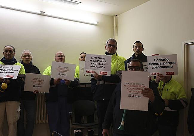 Una treintena de trabajadores del Parque de Servicios se manifestaron con carteles pero en silencio en el pleno de ayer para reclamar que se negocie su convenio. Minutos después fueron desalojados sin incidentes.