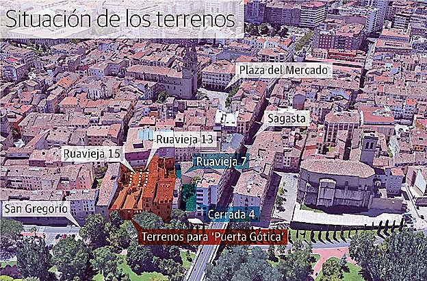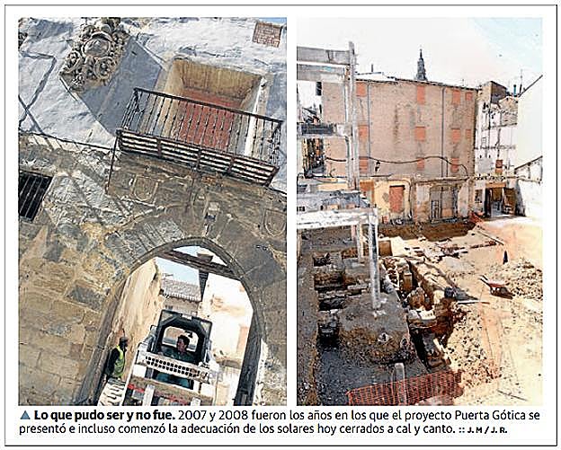 Puerta Gótica cierra definitivamente... sin llegar ni tan siquiera a abrir. Lo que se anunció en el 2007 como un ambicioso proyecto a desarrollar por la iniciativa privada entre los números 9 y 17 de Ruavieja (y sus correspondientes edificios de San Gregorio) con el reto de convertir Logroño en un referente del enoturismo, ha quedado reducido después de una década a un grupo de solares frente al Centro de la Cultura del Rioja (CCR) en pleno Casco Antiguo de la capital riojana con, de momento, pocas salidas.