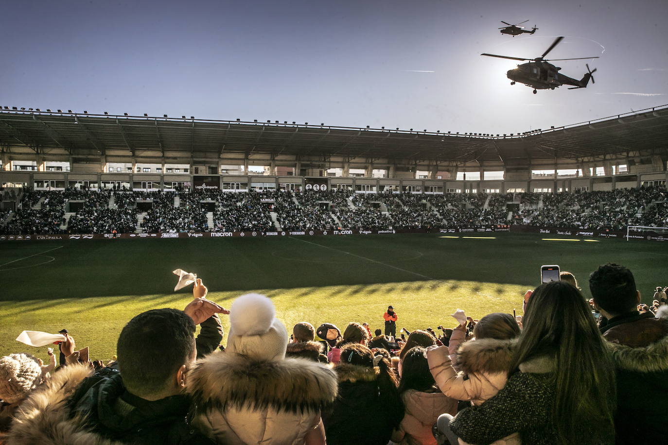 Su aterrizaje está previsto, si las condiciones climáticas lo permiten (se prevé lluvia, pero no niebla) y no hay incidencias de última hora, para las 10.30 horas, donde en el estadio municipal aguardarán un máximo de 13.600 espectadores, aforo determinado, como en años pasados, «con el fin de garantizar la seguridad y dejar libres las escaleras entre gradas».