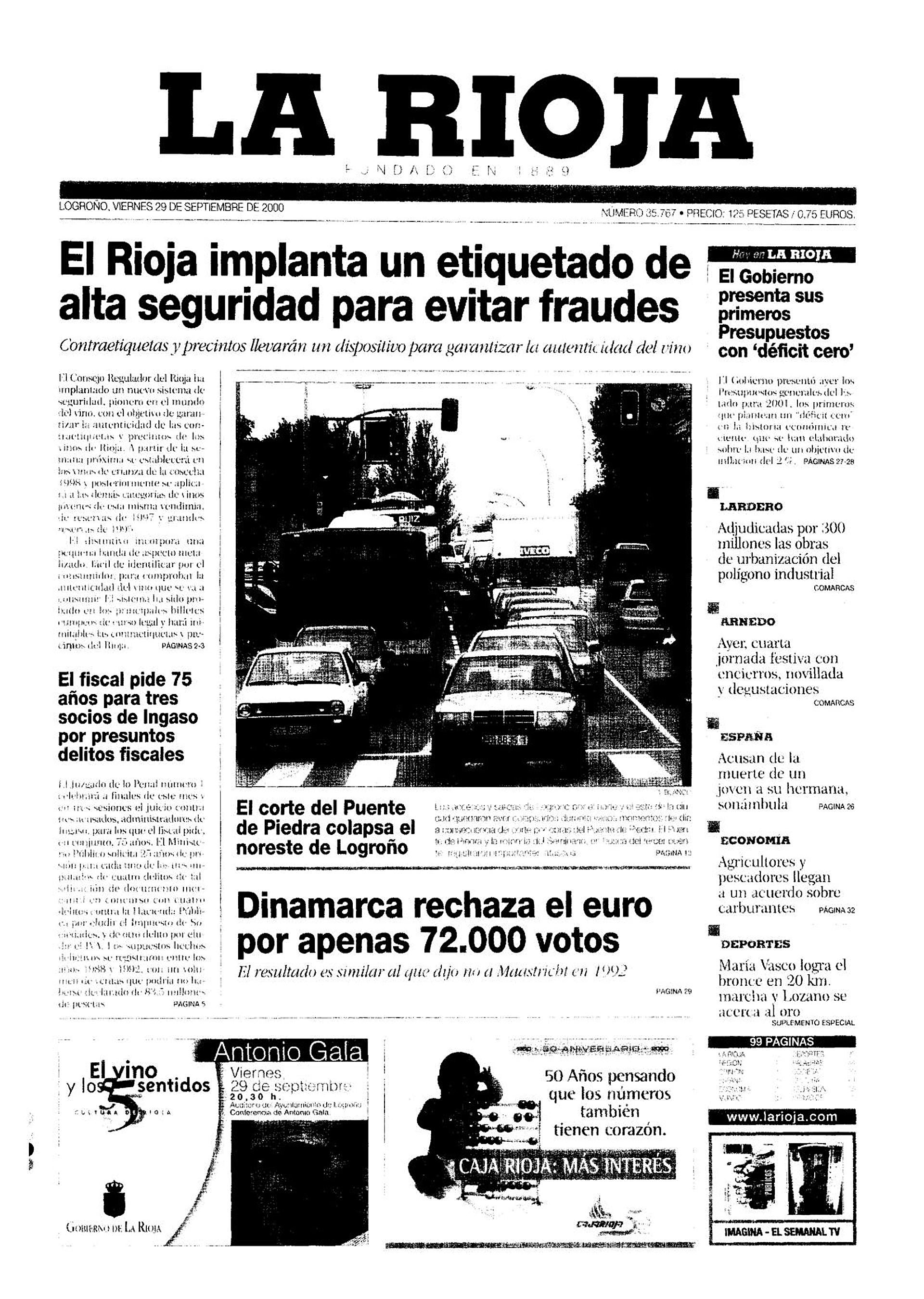Justo hoy hace 25 años, en la portada de este mismo diario, aparecía una noticia que para Rioja era crucial en su lucha por tratar de evitar a los imitadores. El entonces presidente del Consejo Regulador de la DOC, Ángel de Jaime Baró, anunciaba la inminente implantación de un nuevo sistema de seguridad considerado «pionero, único en el mundo del vino» con el objetivo «de garantizar la autenticidad de las contraetiquetas precintas de los vinos de Rioja». «Este sistema, fabricado con tecnología óptica difractiva, incorpora una nueva banda de tono plateado –como en los billetes– y aparecerá en el mercado el día uno –se refería al 1 de octubre de 2000– con los crianzas del 97».