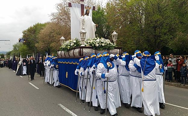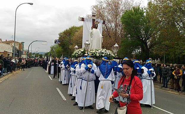 Mientras tanto, fuera, al público se le hacía larga la espera por el tiempo, que apuntaba lluvia, pero la procesión del Santo Cristo Resucitado ha salido puntual y ha salido a las doce, mientras repicaban las campanas de la iglesia nueva de San Antonio.