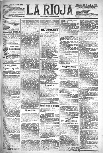 Rememoraba el corresponsal de Torrecilla hace 125 años que «en la vecina Rivabellosa» celebran la festividad de San Jorge porque un día unos malhechores se acercaron a la localidad con ánimo de saquearla. Pero un vecino se apercibió de la presencia de «tan terribles huéspedes» y salió corriendo a tocar «a somatén» las campanas de la localidad para ahuyentar a los forajidos y como todo sucedió un 23 de abril, pues por eso celebraban a San Jorge. Cifraba el diario los precios del vino en el mercado de Arnedo. A 2,25 pesetas la cántara; la de aceite, a 15,50 y la fanega de trigo, a 12. Se relataba también el gusto de los ingleses por los vinos de Jerez. El Rioja entraba en la isla a través de Burdeos, en coupage.