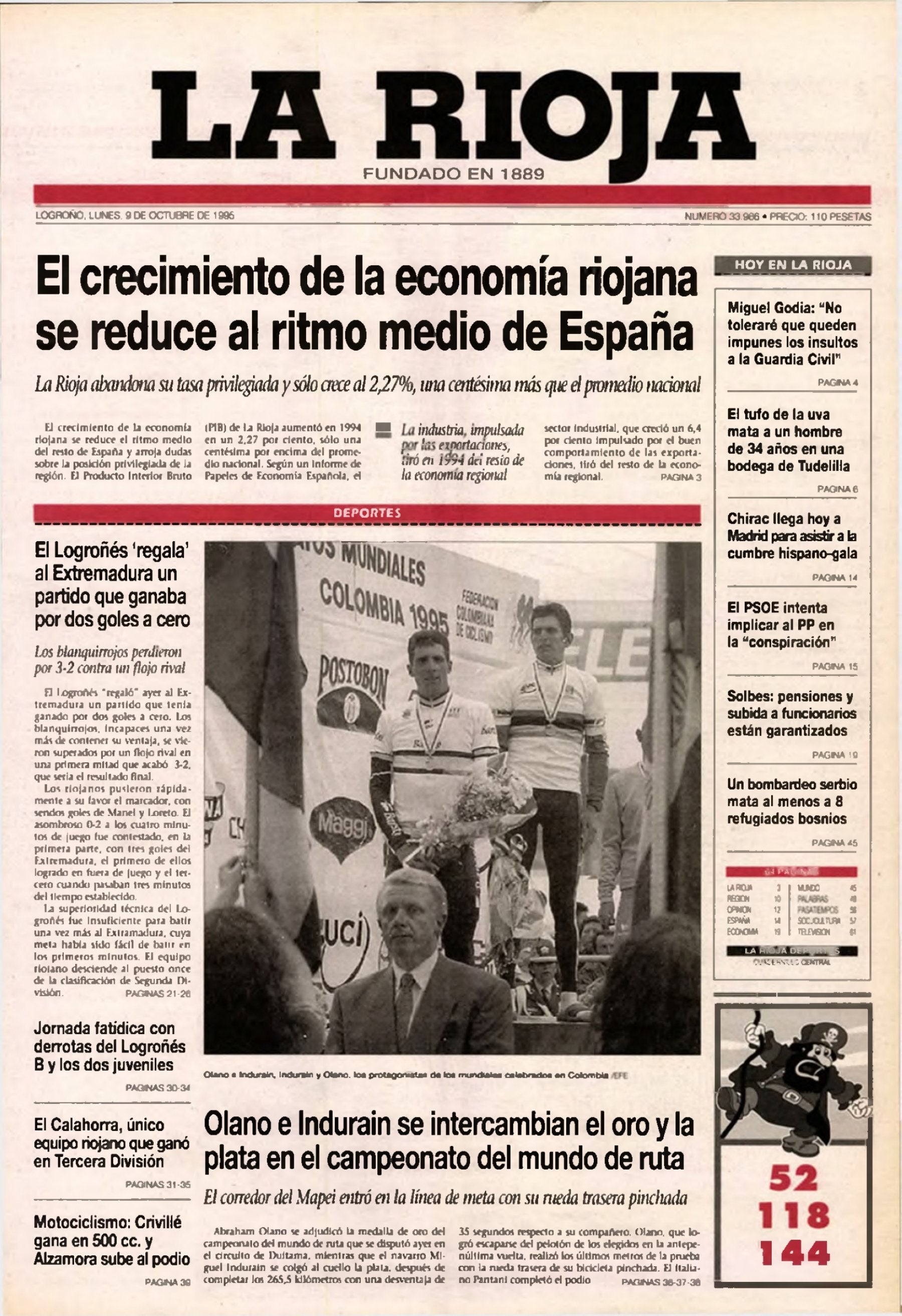«El deporte español ha logrado la gesta más bella de su historia». Así comenzaba la crónica del Mundial de ciclismo en ruta que publicó ... Diario LA RIOJA hace hoy 30 años. Un texto que se titulaba 'Olano, el oro de la fe' y que relataba con detalle todo lo que había acontecido en una carrera disputada en Colombia en la que el ciclismo español logró un histórico doblete. Más allá de por el triunfo de Abraham Olano, aquel hito quedará para la historia por cómo se logró: con el vencedor llegando a la meta con una rueda pinchada y con Miguel Indurain acabando segundo después de haberse sacrificado por su compatriota durante buena parte del recorrido.