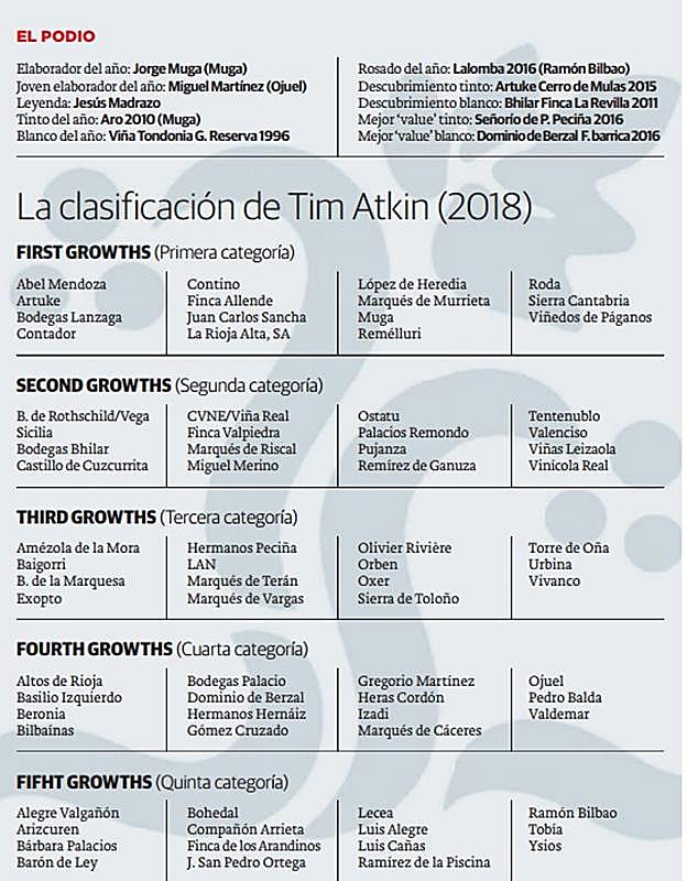 La mejor bodega del año pasado, Artuke, repite en la primera categoría -junto con Abel Mendoza, Lanzaga, Contador, Contino, Juan Carlos Sancha, Finca Allende, La Rioja Alta, López de Heredia, Murrieta, Muga Remélluri, Roda, Sierra Cantabria y Viñedos de Páganos- y su último vino, Cerro Las Mulas, logra el galardón de tinto revelación. Destaca también el ascenso a 'primer cru' de Bodegas Juan Carlos Sancha, quien ha encandilado a Atkin con su colección de garnachas centenarias, varias de las cuales sitúa entre los mejores vinos de Rioja.