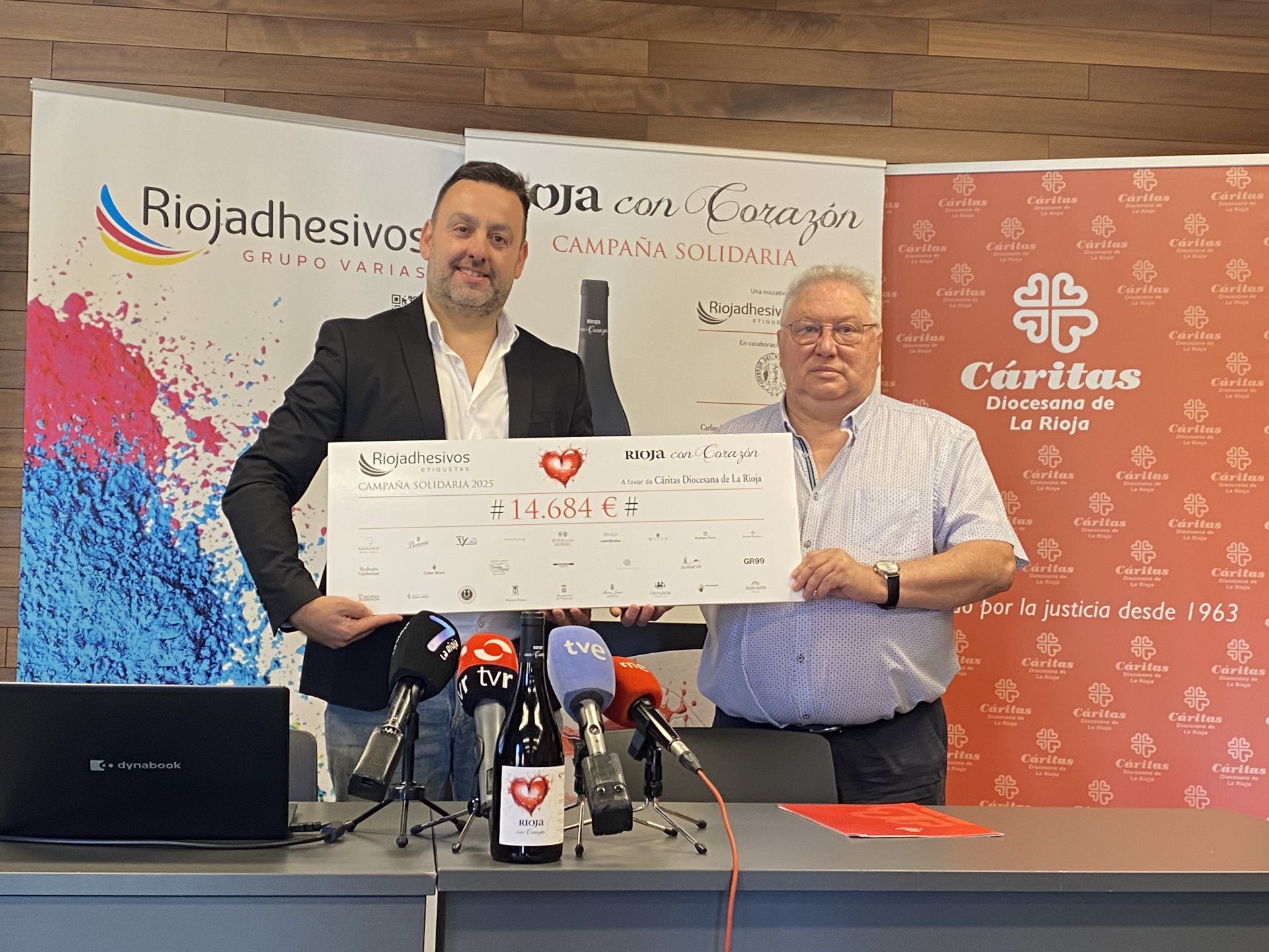 Riojadhesivos presenta su segunda campaña solidaria con un nuevo llamamiento a la participación de las bodegas y con la entrega de 14.684 euros a Cáritas de la pasada ediciónLa iniciativa solidaria 'Riojas con Corazón' ha convocado su segunda edición con la entrega, a beneficio de Cáritas La Rioja, de un cheque de 14.684 euros impulsada por lo recaudado en la primera, con 7.000 botellas de vino de la DOCa Rioja aportadas por 25 bodegas.