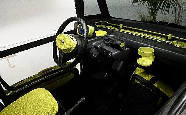 Por último, destacar los portaobjetos, ingeniosos y portátiles. Cada uno tiene su función dentro del habitáculo, pero puede sacarse al exterior con motivo de un picnic o de una excursión. Un espacio de almacenaje se ha encastado asimismo en las puertas, a la altura de los asientos para dejar todo tipo de objetos o una gran bolsa desmontable, cuyas dimensiones coinciden con el hueco previsto y que puede abrirse desde el interior para dejar los objetos de uso cotidiano. Un divertido botón pulsador permite abrir el cierre centralizado de puertas que se abren, igual que en Ami, en sentido inverso.