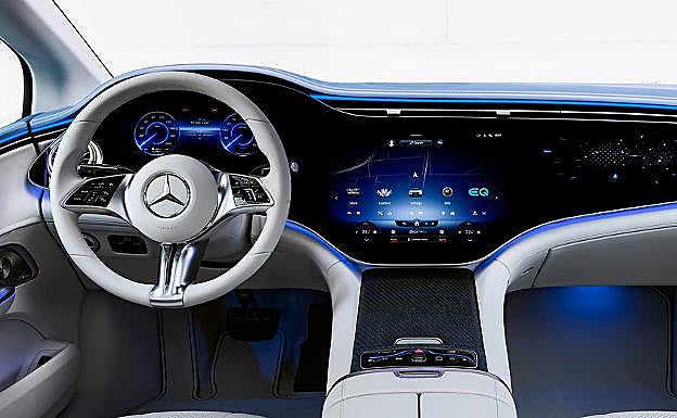 El equipo más llamativo del interior del vehículo es, sin duda, la innovadora MBUX Hyperscreen disponible como equipo opcional. Esta pantalla alabeada de grandes dimensiones se extiende con elegancia entre los dos montantes delanteros, prácticamente de lado a lado del vehículo. Tres pantallas dispuestas bajo un cristal cobertor configuran una unidad óptica. El visualizador OLED de 12,3 pulgadas de diagonal frente al asiento del acompañante pone a disposición de su ocupante un área propia de visualizado y de manejo. En Europa, el acompañante puede disfrutar de contenidos dinámicos también durante la marcha. Para ello, Mercedes recurre a un esquema lógico inteligente de bloqueo, basado en cámaras. Si la cámara percibe que el conductor dirige la vista hacia el visualizador del acompañante, se atenúa automáticamente la representación de determinados contenidos.