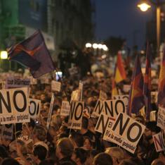 Esa infranqueable frontera de los antidisturbios de la calle Cedaceros -"Asesinos, basura, escoria y vergüenza"- separa dos mundos que se miran y no se reconocen: a un lado, se celebra la democracia, a otro, se denuncia un golpe que Elena Martínez, convocante de la marcha, estuvo a un tris de definir como "golpe de estado". A esto le suman ustedes anarquistas, independentistas castellanos, comuneros, podemistas, socialistas cabreados, simpatizantes de la izquierda abertzale, una que reparte abrazos gratis, el de la pancarta de Lorca, los críos que vinieron con sus padres, los optimistas y los chinos que venden cervezas de un carrito y no es que haya dos Españas, es que hay diez y siete.
