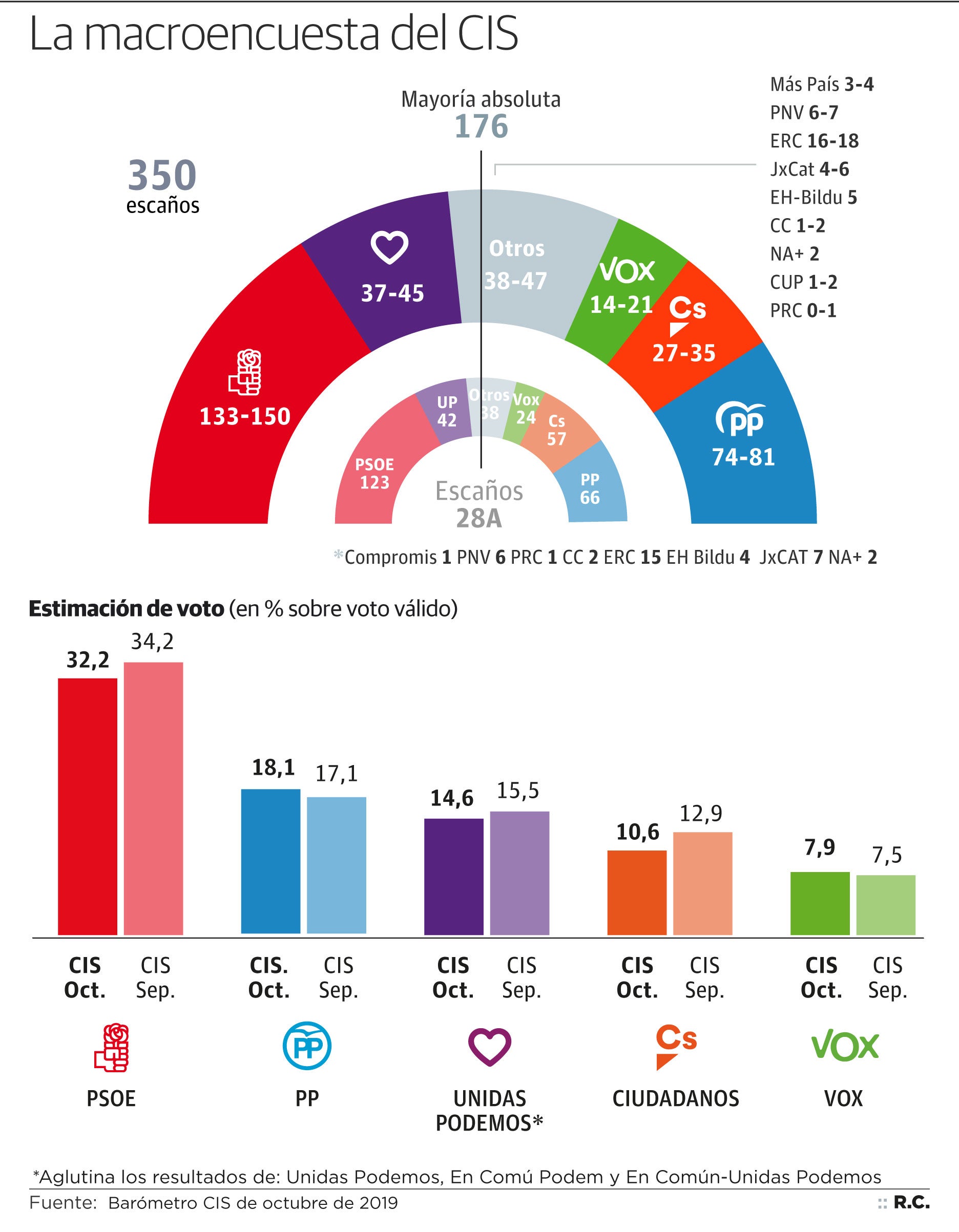 El CIS hizo las entrevistas entre el 21 de septiembre al 13 de octubre, antes de la sentencia del Supremo, de los disturbios en Barcelona y de la exhumación de Franco. El impacto de estos hechos en el electorado es una incógnita. Los socialistas apuntan a que será favorable para ellos, los sondeos privados dicen lo contrario.