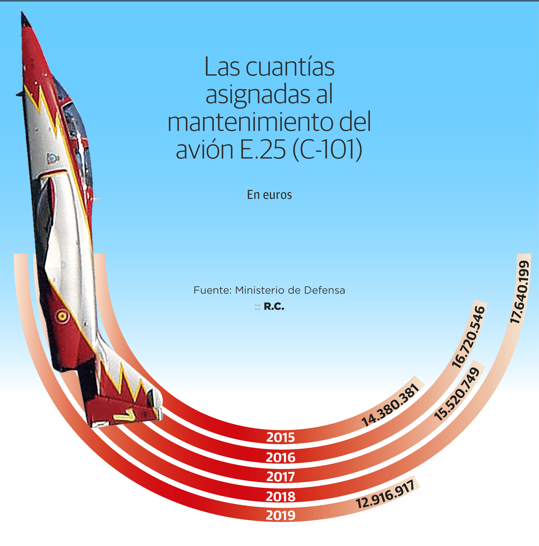 El Mando de Apoyo Logístico (Malog), unidad que depende directamente del jefe del Estado Mayor del Aire (JEMA), general Javier Salto, destinó 12,9 millones de euros al sostenimiento de este avión español de entrenamiento construido por Casa en la década de los setenta. Un año antes, en 2018, la misma partida se elevó hasta los 17,6 millones, la más alta de los últimos cinco años.