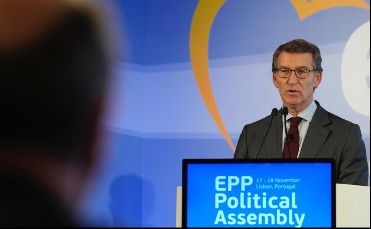 Feijóo este jueves en Lisboa durante su intervención en la Asamblea del Partido Popular Europeo. E.P.