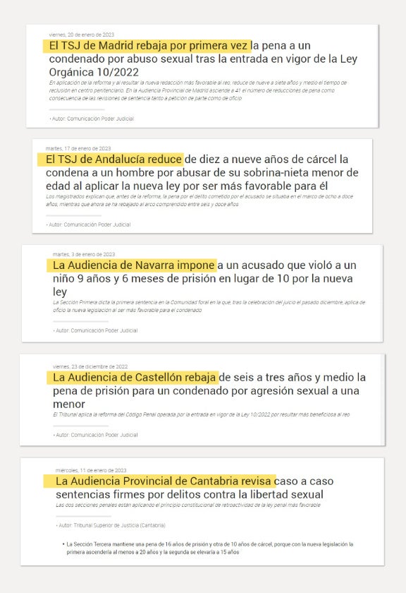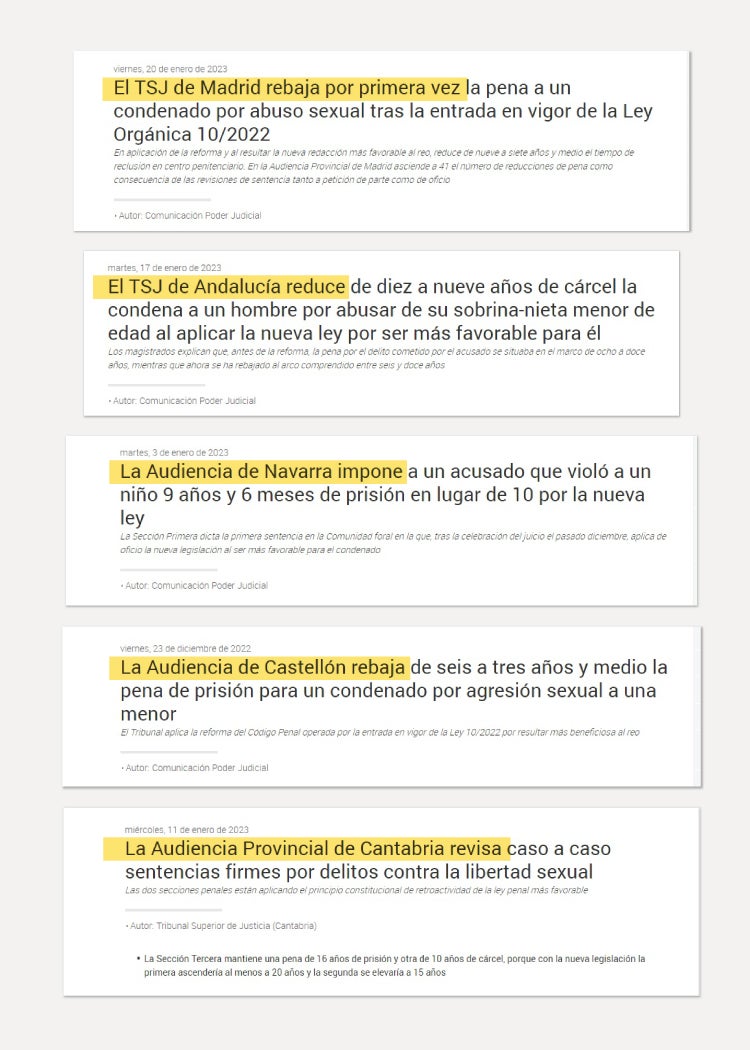 Esta misma semana se ha reducido de nueve a siete años y medio de prisión la condena impuesta a un hombre que abusó de una menor en Murcia. La semana pasada fue puesto en libertad en Lleida un violador múltiple con casi una veintena de agresiones sexuales en su expediente, bajo la advertencia por parte de los servicios penitenciarios de un alto riesgo de reincidencia. En Córdoba se redujo un año de cárcel a un hombre que había abusado sexualmente de la hija menor de su pareja. Algo parecido ha ocurrido en Cantabria, donde una pena de ocho años de prisión pasa a seis años para un hombre que abusó de un chico de catorce años al que obligó a hacerle una felación. Y así hasta más de trescientas reducciones de condena desde la aprobación de la ley.