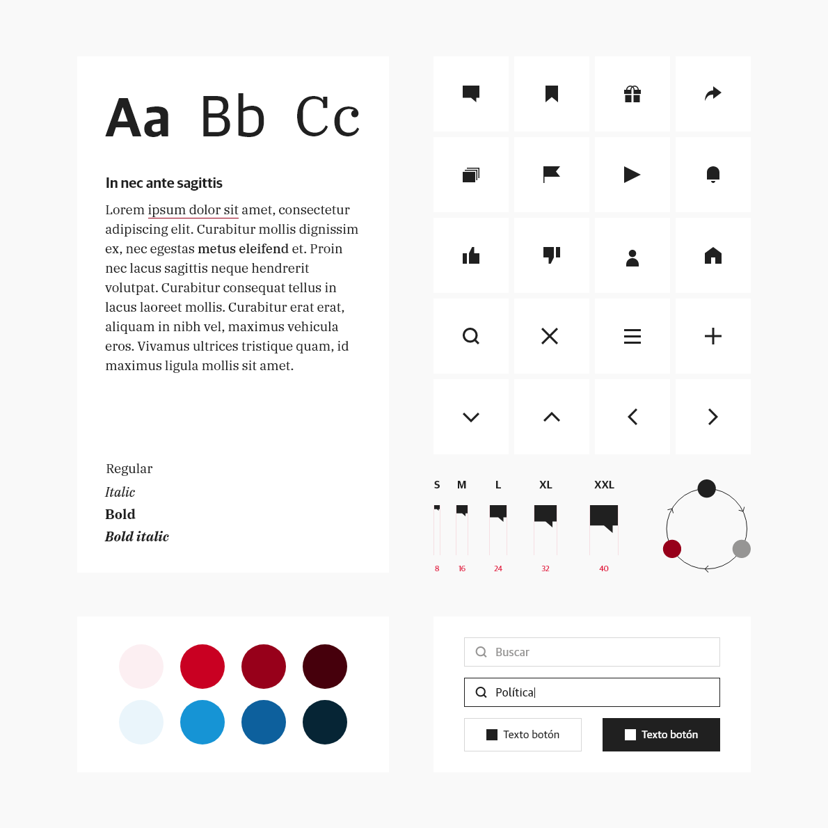 Colores y tipografías. Mantenemos las tipografías que nos caracterizan: Guardian Sans para los titulares, e IBM Plex Serif para los textos y los titulares de opinión. Sin embargo, hemos decidido actualizar nuestra paleta de color para ofrecer una imagen atractiva y rigurosa sin perder el estilo que caracteriza nuestra web.