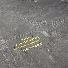 Greenpeace despliega una pancarta gigante junto a las líneas de Nazca