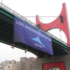 Cinco activistas de Greenpeace se han colgado desde el puente de La Salve, que da acceso al centro de Bilbao, con una pancarta en la que reclaman protección para los océanos y tratarán de permanecer suspendidos a unos 12 metros del puente, sobre la ría.