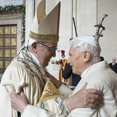 El papa Francisco saluda al papa emérito Benedicto XVI.