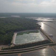 Imagen de dron de una inmensa balsa de riego construida en un pinar en el entorno de Doñana.