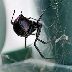 La araña viuda negra occidental (hesperus Latrodectus) es originaria de Norteamérica occidental. Las hembras tiene alrededor de 15 mm de largo y son negras, con una marca en forma de reloj de arena roja distintiva en el abdomen. El macho es mucho más pequeño, con un color marrón más ligero y abdomen rayado. Las viudas negras construyen telas que utilizan para comunicarse a través de las vibraciones y feromonas.