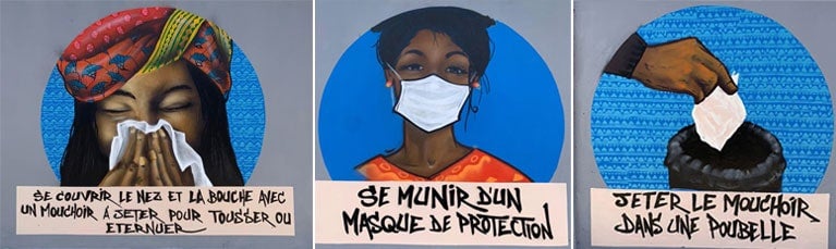 En Senegal, son los grafiteros los encargados de distribuir con sus imágenes el mensaje a la población. La cultura urbana popular se ha convertido en el mejor vehículo para difundirlo. En este país africano no todo el mundo tiene acceso a la televisión o la radio, por lo que murales en las calles informan de las principales prevenciones sanitarias. Los mensajes sencillos y llenos de color imprengnan las calles de las principales ciudades como Dákar.