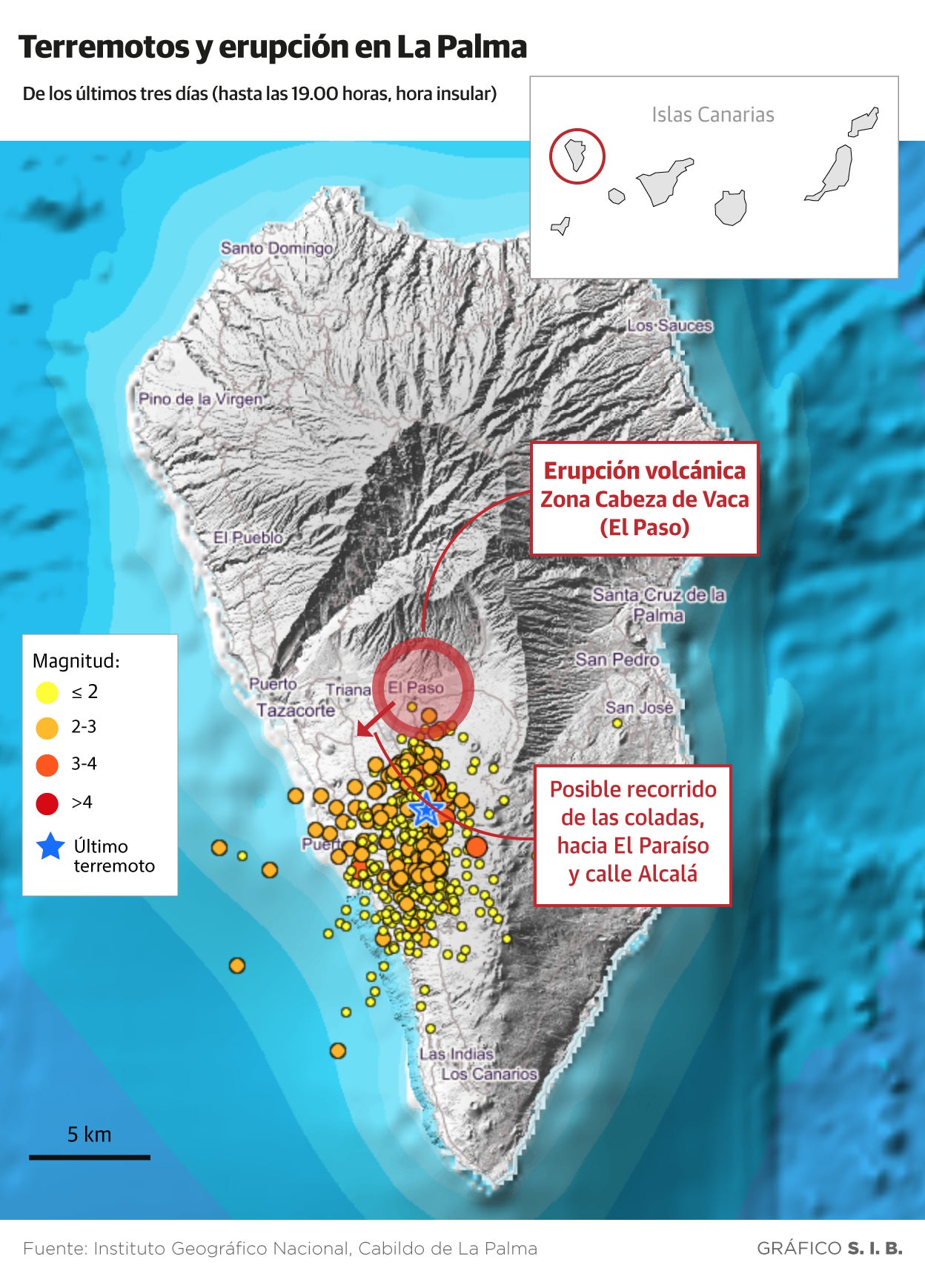 15:12 hora canaria, una más en la España peninsular. Esta fue la hora exacta en la que ayer el fluido magmático se abrió paso entre la tierra canaria de Montaña Rajada, en el municipio de El Paso. Así se puso fin a más de una semana de temblores (el Instituto Geográfico Nacional (IGN) registró más de 6.600 pequeños seísmos) que ha acabó con un pequeño terremoto en el barrio de Las Manchas, al sur del municipio de El Paso, con foco en superficie y que dejó una enorme columna de humo y la expulsión de piroclastos. El resto ya es historia.