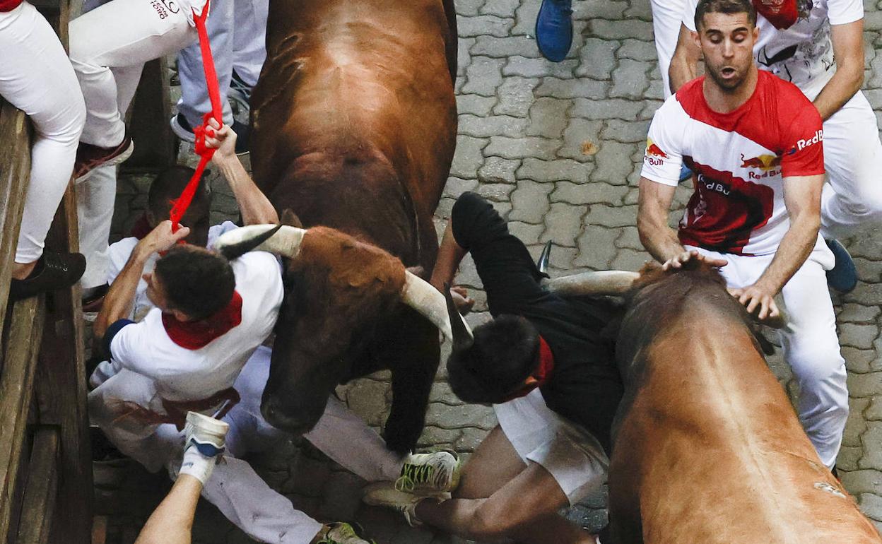 Los toros de Cebada Gago han sembrado hoy el pánico en el encierro de Pamplona. La manada, que ha ido estirada prácticamente durante toda la carrera, ha protagonizado varios momentos de tensión, especialmente en el acceso a la Plaza de Toros, donde un toro se ha dado la vuelta a la entrada del callejón llevándose por delante a los mozos que venían corriendo por detrás. En el interior del ruedo, otro astado se ha cebado con un corredor que se encontraba junto a las tablas.