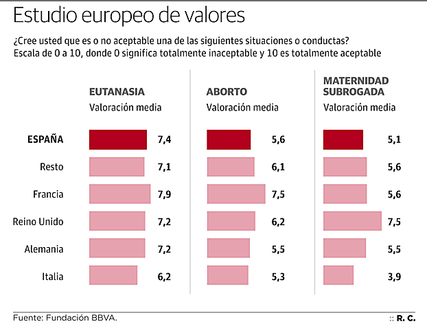 El respaldo a la aplicación de la eutanasia genera un enorme consenso en la sociedad española a la vista de los resultados del 'Estudio europeo de valores 2019', elaborado por la Fundación BBVA. Siete de cada diez españoles son muy o totalmente partidarios de autorizar esta práctica, con supervisión y ayuda médica, para «los enfermos en fase terminal de una enfermedad incurable que han expresado su voluntad de no seguir viviendo». Solo el 11% está en total desacuerdo, según el mismo informe, elaborado a partir de 1.500 encuestas en España y en cada uno de los otros grandes países europeos (Alemania, Reino Unido, Francia e Italia).