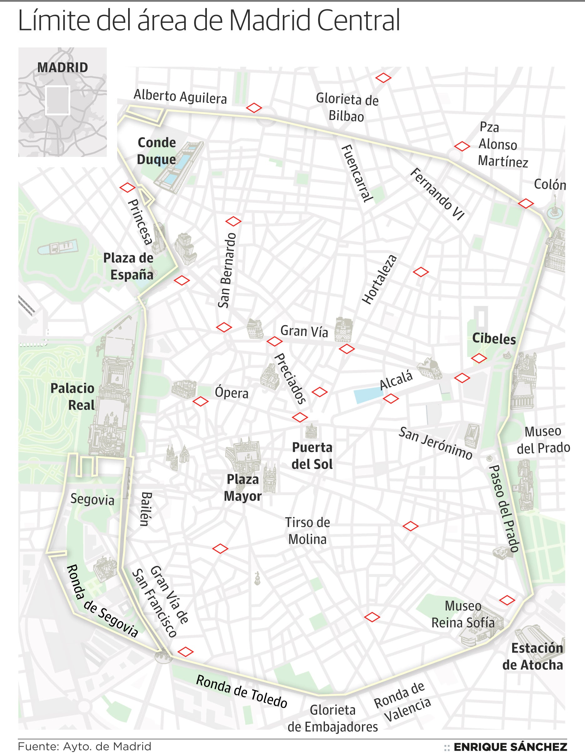 Ese día, el Ayuntamiento que dirige Manuela Carmena pone en marcha 'Madrid Central', con el que se elimina el 40% del tráfico en el interior de la llamada almendra central de la ciudad. Es una superficie de unos 10 kilómetros cuadrados delimitada con unos carteles específicos tanto en señales verticales como pintados en el suelo.