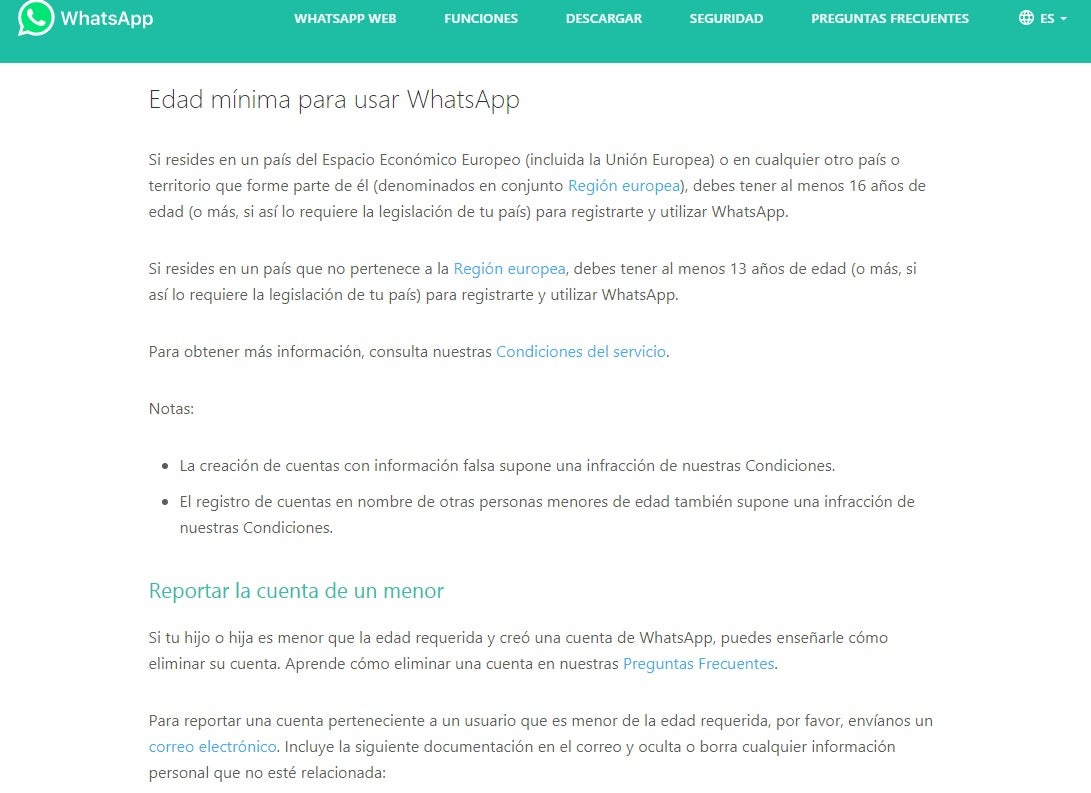 «Si vive en un país de la Región de Europa, debe tener al menos 16 años para usar nuestros Servicios o la edad requerida en su país para registrarse o usar nuestros Servicios», se puede leer en las condiciones de Whatsapp.