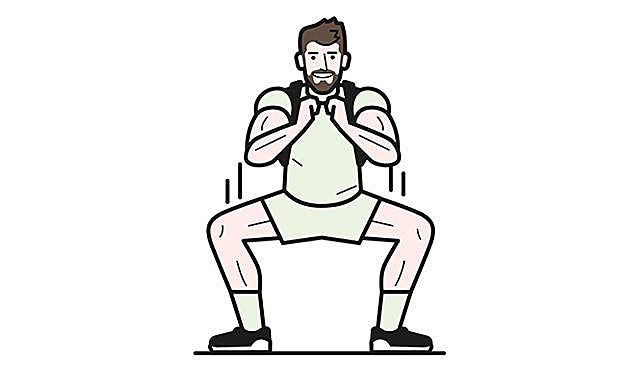 Llena la mochila (de 2 a 10 kilos). Piernas separadas un poco más del ancho de los hombros, espalda alineada, talones apoyados en el suelo, puntas de los pies ligeramente abiertos y brazos estirados. Flexiona las rodillas en ángulo recto, como si te fueras a sentar, dejando que la cadera se desplace hacia atrás. Acompaña juntando las manos por delante a la altura de la cintura. Vuelve a la postura inicial.