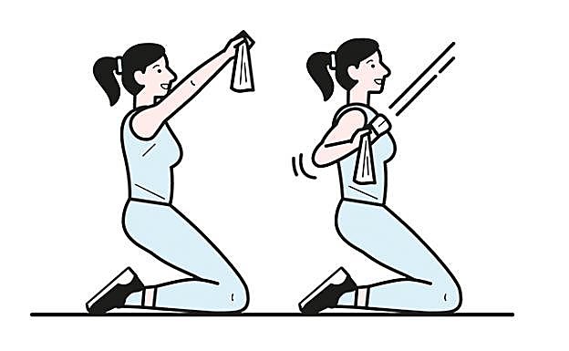 Ponte de rodillas en el suelo con la cadera elevada y agarra una toalla por los extremos, con los codos flexionados en ángulo recto y las palmas de las manos hacia arriba. Lleva los codos hacia atrás en ángulo recto, de manera que la toalla presione justo por encima del pecho. A continuación, estira los brazos hacia delante.