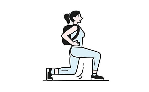 Con la mochila, separa las piernas al ancho de hombros. Da un paso hacia delante con la pierna derecha y flexiona la rodilla casi hasta tocar el suelo. Regresa a la postura inicial. Repite con la otra pierna.