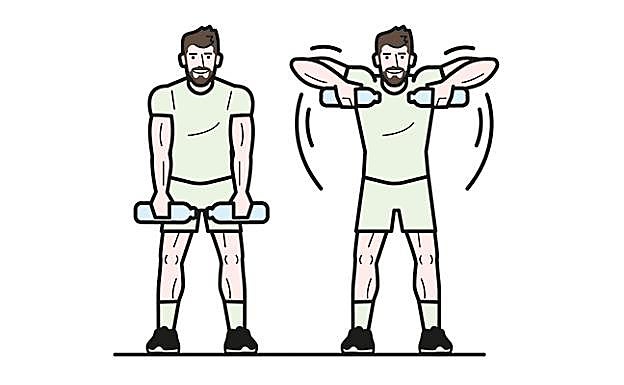 Elige dos botellas o garrafas de un peso entre 2 y 10 kilos. Separa las piernas al ancho de las caderas, las rodillas ligeramente flexionadas y la espalda, alineada. Levanta los codos flexionándolos en ángulo recto de manera que queden en la misma línea que los hombros, con los antebrazos perpendiculares al suelo. Vuelve a la posición inicial.