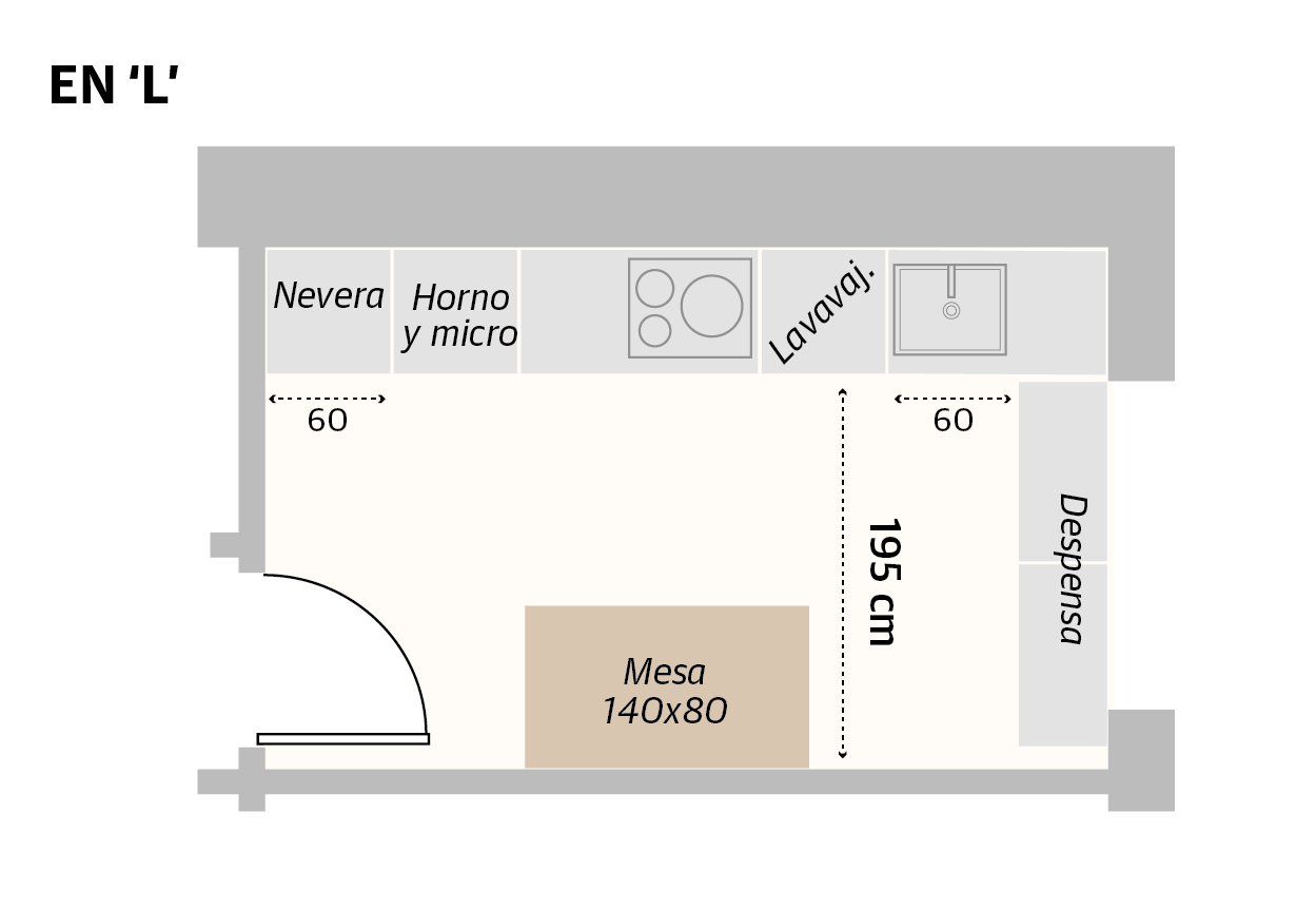La distribución es 'L' es otro clásico. Es muy versátil y resulta idóneo tanto para espacios amplios como para los más reducidos. «En las cocinas pequeñas de planta cuadrada o alargada, este tipo de disposición ayuda a rentabilizar el espacio disponible, ampliando y organizando cómodamente tanto el área de trabajo como la de almacenaje, además de proporcionar a la estancia una mejor iluminación». Según explica Zubizarreta, se trata de una distribución atemporal que se ve cada vez más en las cocinas de pequeñas dimensiones modernas y actuales.