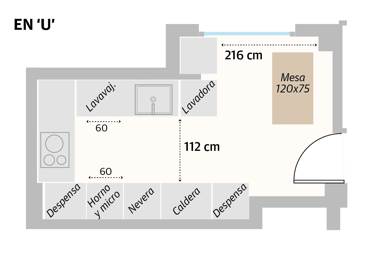 Es una de las distribuciones más clásicas, pero también una de las más prácticas y de las que más espacio necesita para resultar cómoda. «En las cocinas en forma de 'U', el fregadero suele estar en una pared, la placa en otra y el horno en otra. Así, al desplazarse por el triángulo que forman los tres electrodomésticos se aprovecha cada vértice para una función específica. Generalmente, cuando se tienen estas tres paredes, no queda espacio para colocar una isla o península por muy bonita que sea. Por eso, resiste la tentación de recargar tu cocina y aprende a sacar lo mejor de lo que tienes», aconseja Natalia Zubizarreta.