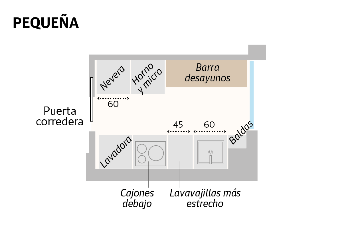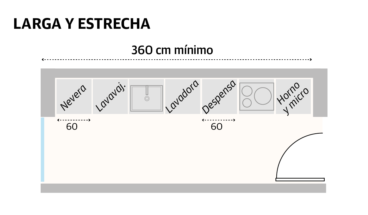 Los diseños lineales están pensados para espacios pequeños y alargados, de manera que todos los muebles se colocan en la misma pared, generalmente en el frente donde están ubicadas las tomas de agua y de energía eléctrica. Si la idea es hacer una cocina modular con los elementos básicos, el espacio mínimo requerido es de al menos 3,60 metros de pared y se distribuiría de la siguiente manera, empezando por la entrada: «Normalmente, se coloca la nevera en una esquina; a continuación, se deja un espacio de encimera de 60 centímetros para el lavavajillas (también podría ser la lavadora); después, el fregadero; otro módulo de 60 centímetros para la lavadora (o el lavavajillas); un nuevo módulo de cajones o puerta y, finalmente, la zona de cocción con el horno.