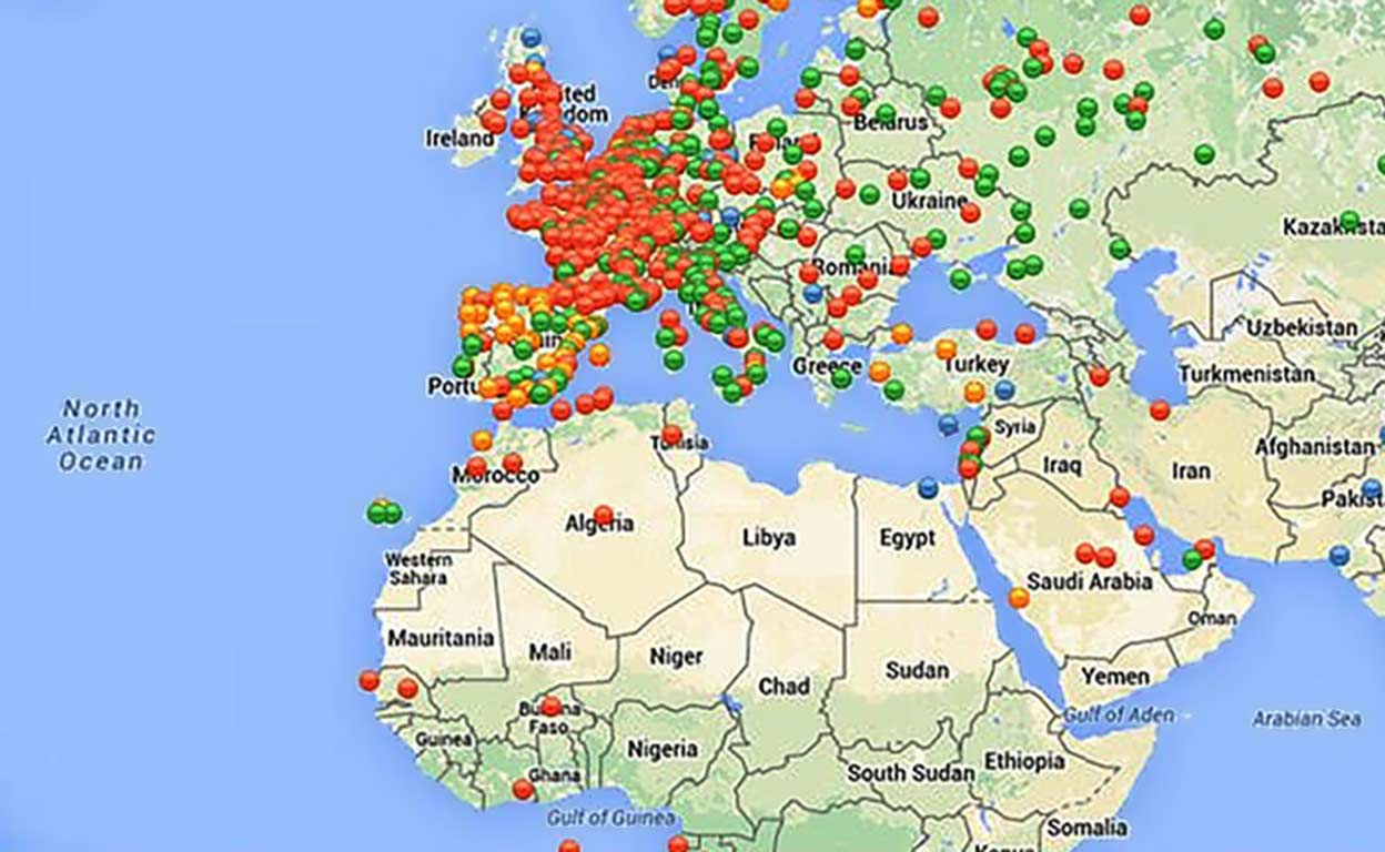 La organización Child Rescue Coalition, con sede en Florida, ha creado una tecnología de rastreo –plasmada en mapas como este– para identificar ordenadores que comparten y descargan imágenes y vídeos de niños sexualmente explícitos. Según esta organización, más de 750.000 pedófilos se mantienen on-line de forma casi constante en el mundo e intercambian material, retransmiten abusos en directo, extorsionan a niños para producir pornografía infantil o están en proceso de hacerlo. La Policía de 97 países usa esta herramienta, que ha contribuido al arresto de más de 14.000 pedófilos, al rescate de más de 3300 niños y a prevenir cerca de 720.000 casos de abuso a menores.