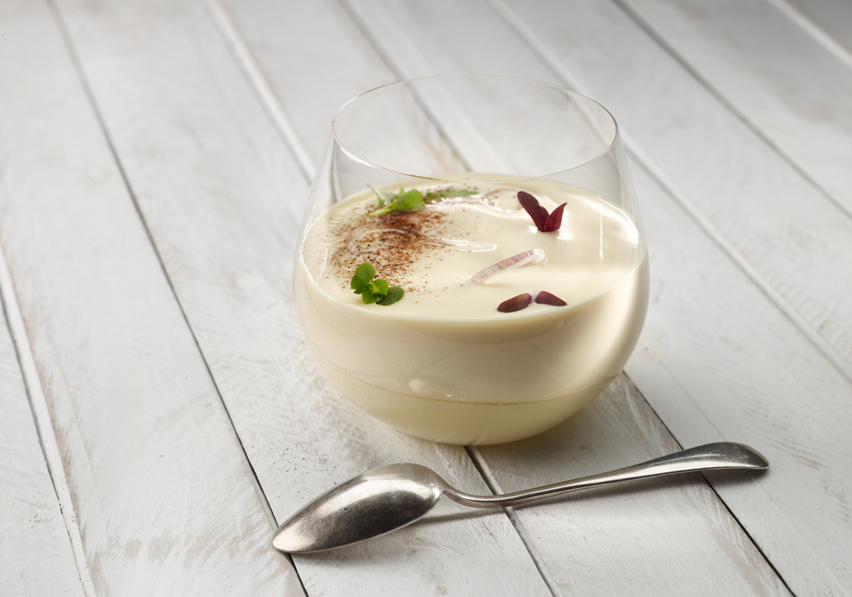 Para terminar, se acondicionan unas copas para poder hacerlo por capas. Al fondo de las copas se coloca el puré de patata a un tercio del volumen total. Se echan luego los cinco gramos de cebolla francesa laminada. ¡Y listo! Ya tenemos nuestra receta de capuchina de patata y queso terminada.