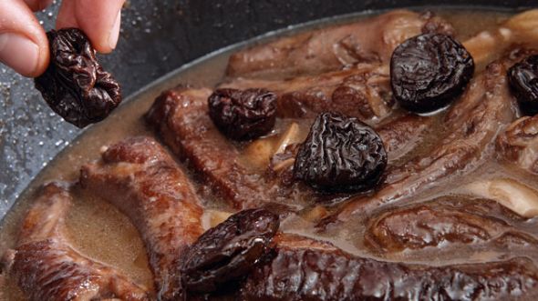 Acabado y presentación. 20 minutos antes de que se acabe de cocer, se añaden las ciruelas. Se retira del fuego y se rectifica de sal y pimienta. ¡Y listo!
