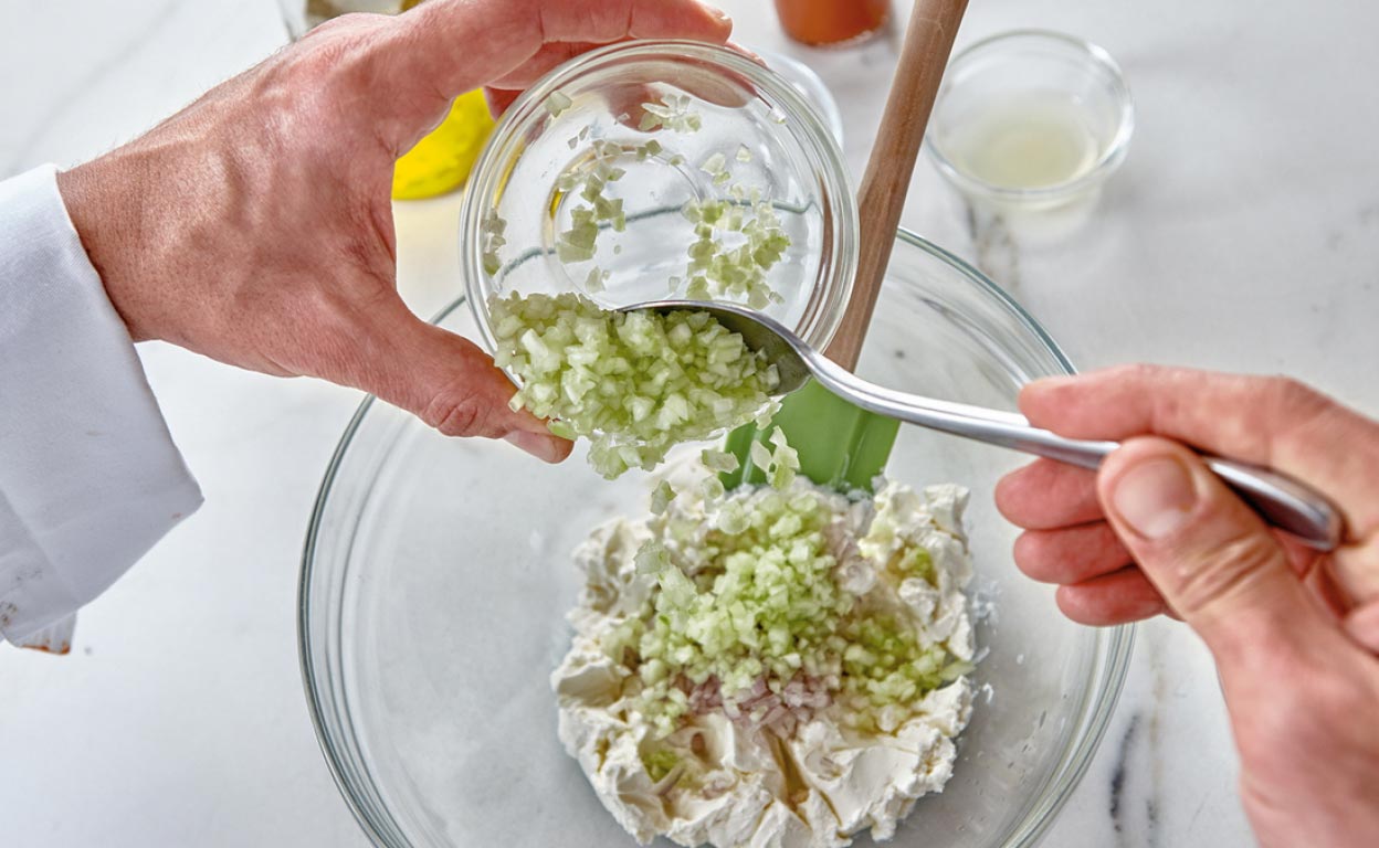 Para empezar con la receta de sándwich de queso con espárragos, mezclamos, con el resto de los ingredientes, la media cebolla ya picada y escurrida tras haberla dejado 1 hora en agua.