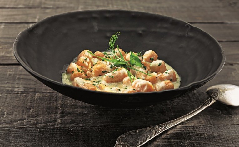 Se cuecen los ñoquis en agua hirviendo con un punto de sal 1 o 2 minutos hasta que los ñoquis floten. Se escurren y colocan dentro de la salsa reservada. Se cocina el conjunto 2 minutos, se pone a punto de sal y pimienta y se espolvorea con el cebollino.
