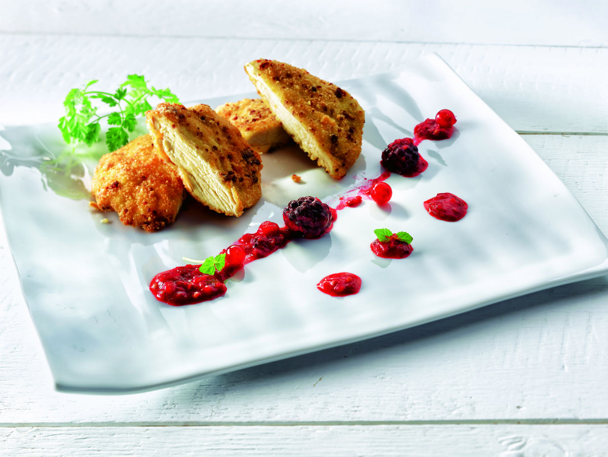 Atemperamos las pechugas de pollo y las cortamos en filetes de unos 0,5 centímetros, aproximadamente.