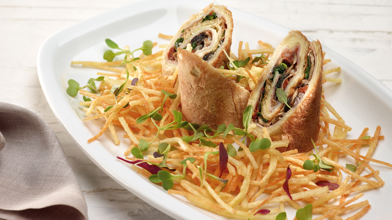 3. Acabado y presentación. una vez que tenemos las bandas de pan estiradas, las rellenamos con la cebolla pochada, los champiñones, el tomate, las láminas de queso, las lonchas de jamón cocido y las hojas de espinaca ligeramente salpimentadas, enrollando el pan de tal modo que encierre el relleno, como si fuera un brazo de gitano.